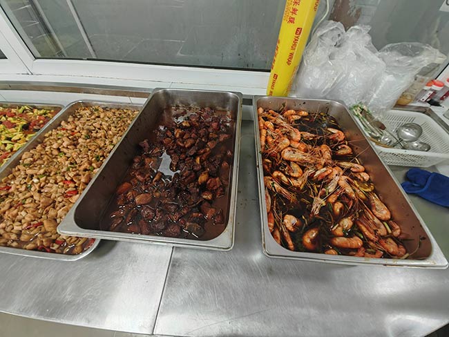 趣味运动会刚结束,正值午餐时分。今天的威德大食堂借着厂庆的欢乐气氛,为大家增添了一道丰盛大荤,红烧肉、捞汁罗氏虾、两个小荤、两个蔬菜,任你选择,让刚刚参加完运动的员工们感到能量迅速得到补充,倍感满足。