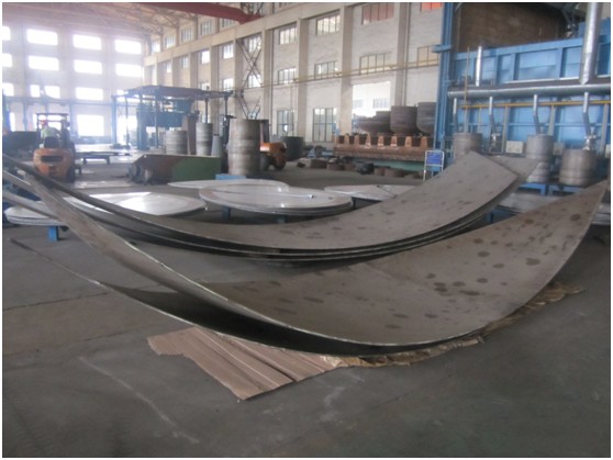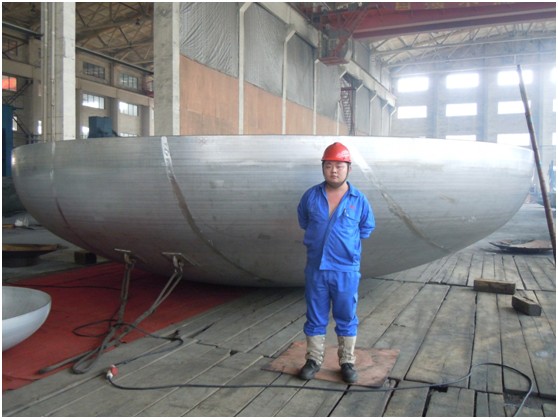 紧接着,各部门齐心协力,克服了制作过程中的种种困难,对每一分片做了精确的下料,并连夜赶制特殊的焊接工装,以惊人的速度完成了条状分片的压制,用精湛的手工焊技术拼接成半成品,最后至十米旋压机直接旋压成型。期间,每一道工序,无一不体现出我公司雄厚的技术力量以及团队合作精神。