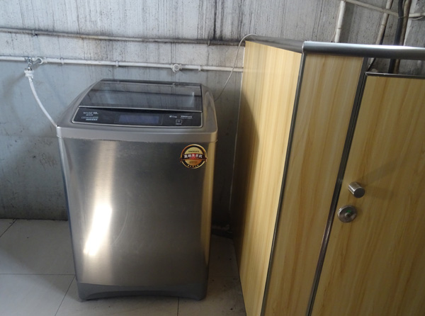 为方便员工生活,让员工穿戴更整洁,公司在原先的锅炉房处新建了一个洗衣房,里面安装了一台新式洗衣机,一次性可以为员工清洗工作服8—10件套。