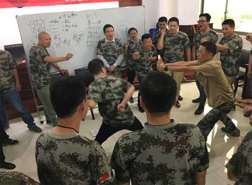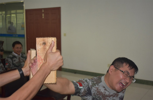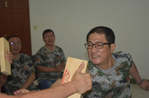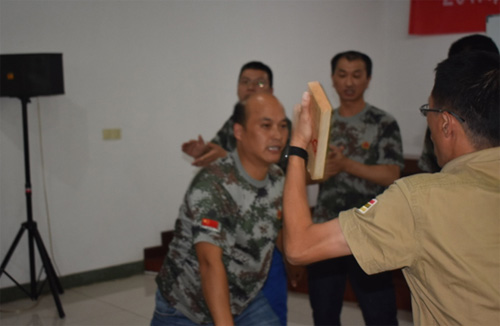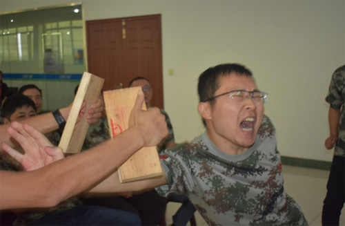 9月23日下午,重头实践环节是“突破与超越”——徒手碎木板!6个小组每组抽取一名志愿者。 在单掌劈木之前,教练先着重讲解操作规范和动作要领。