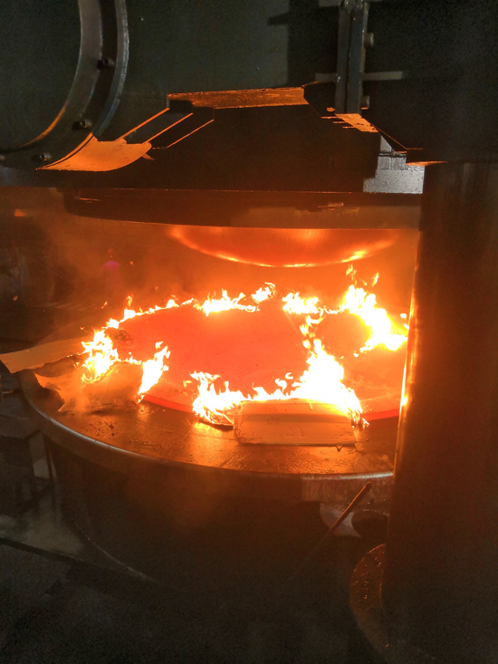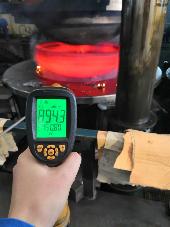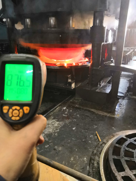 保温时间到了,热处理炉炉门开启,两个热气逼人、通体发红的封头立即闪现在眼前,虽然叉车车身前部被隔热棉遮住了大部分,影响到了视野,但是叉车工还是很娴熟地将封头铲出,当封头稳稳的落在铲齿的那一刻,潘志国加大油门,争分夺秒快速掉转车头,火速前进将炙热如火的封头放入6600T的移动工作台上。生产部副部长袁祖强手持高温远红外测温仪一路奔跑记录热冲封头的温度。而6600T所有接应人员也屏住呼吸,主操作工一气呵成将工作台送入模具正下方,快速调整好模具中心,在模具重重的压力下,一次热冲压封头就这样诞生了,当模具抬起,封头工作台升起,被压成型的封头像身穿暗红色礼服的主角一样展示在大家眼前,所有在场人员都相视而笑,发出阵阵掌声,有的竖起了大拇指。第一个热冲封头完成得很顺利,也给了大家一个坚定的信心,大家在热冲封头旁脸上都挂满了汗水,但心情却是无比的激动。