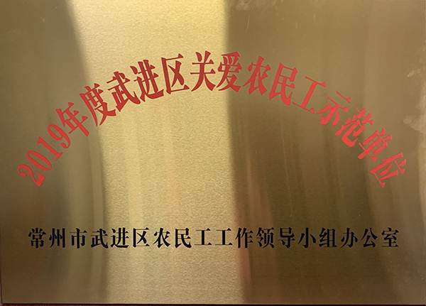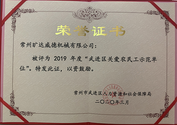 近日,常州旷达威德机械有限公司荣获2019年度“武进区关爱农民工示范单位”荣誉称号。