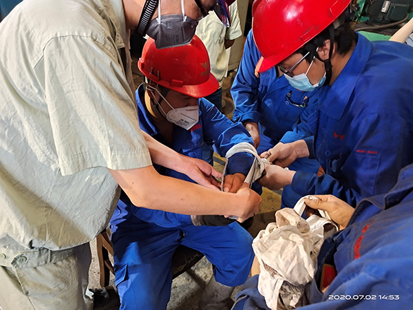 该演练活动模拟操作工违章作业,致使其中一人右手臂被压在椎体封头与设备基座之间,导致小臂骨折的情形。事件发生后,应急指挥员袁祖强对事故情况进行迅速评估,启动一级应急预案,救援队长孙卫强马上按照应急预案组织人员开展应急救援,就地取材固定伤者骨折部位,并及时送医。救援过程中做到防止伤员不受二次伤害。