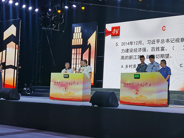 比赛当天下午3点,我们提前到达太湖湾广场进行相关排练。有一位领导说到,“旷达队成员是本次比赛唯一一家由企业排出的选手,其他队伍都是通过层层选拔出来的精英,你们要加油,不能太难堪哦。”我们团队本来在安心复习题目,突然听到领导讲话后,倍感责任重大,一下子加剧了我们的紧张感,真有一种树欲静而风不止的感觉。确实,有的战队实力很强,连续答题可以破千。面对强大的对手,我们只能默默为自己加油,用平常心对待。我们旷达智造队冷静分析和猜想了其他队员的实力,甚至预测了进入决赛的队伍,一致认为,自己的实力或许不如其他队伍,但我们的气势不能丢、意志不能输。