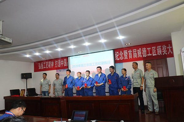 会议的第二项议程是表彰奖励2020年7~8月份评选出来的工艺纪律执行先进班组、先进个人进行。董事长曹立宏、常务副总杨庆高,副总经理龚文伟、常立寒一起给他们颁发奖金并合影留念。会上,还特意给坡口班员工吴悉颁发了特别质量奖金。