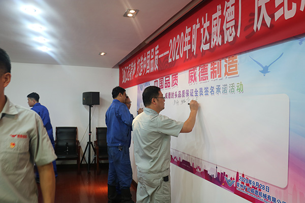 质量是企业之本,质量是企业的生命。大会的第三项议程是“威德封头品质保证集体签名承诺活动”,签名前,短片《中国品质 威德制造》进一步振奋了全体员工的信心,大家在齐声高呼“遵规守法、精细制造,以一流的产品开拓市场;自强不息、科学管理,以一流的服务赢得客户;产品百分百满足客户需求”后,伴随激情旋律,公司董事长曹立宏先生带头上台,在威德封头质量保证巨幅墙布上第一个签上了自己的名字,三位副总依次上台签名,随后全体员工纷纷起立逐排登台作品质承诺签名。