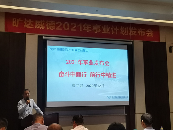 下午1:30,2021年事业计划发布会在常务副总杨庆高的主持下如期举行。曹立宏董事长率先作题为“奋斗中前行,前行中精进”的主题报告。他向与会者汇报了2020年事业计划完成情况,分析了公司目前面临的基本状况和主要问题,明确了2021年度旷达威德事业目标,摆出了各部门所面临的的课题及工作目标。他向大家提出了在业内的“中国品质,威德制造,开创威德品牌新纪元”的愿景和方向。