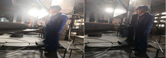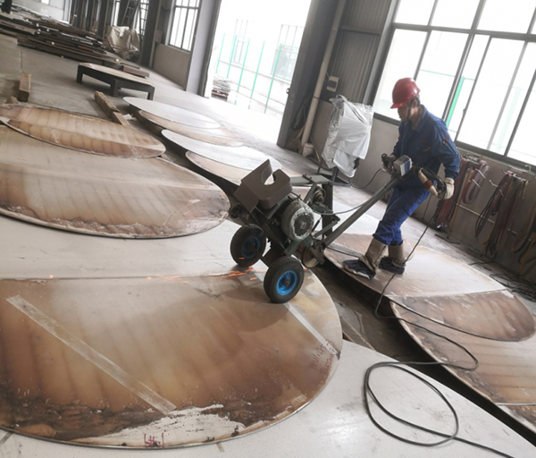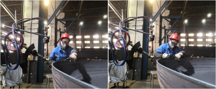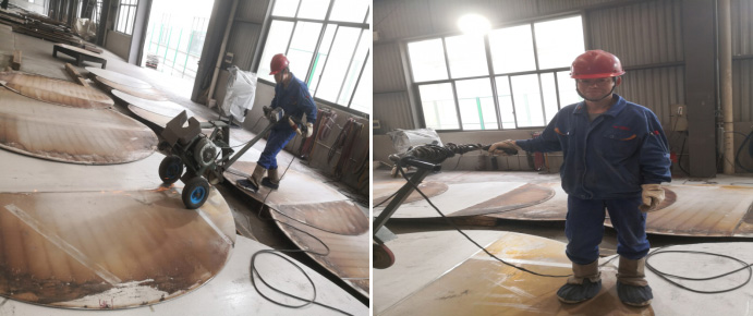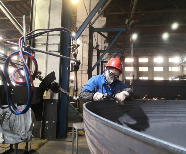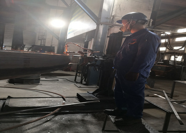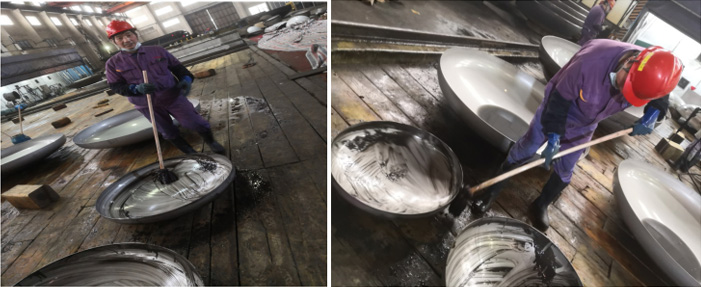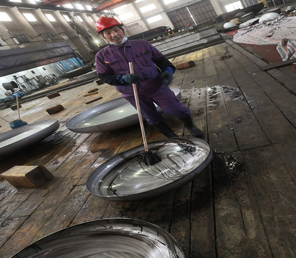 采访完唐科长,我又往车间里面走,看到酸洗场地上有几个工人在洗封头,我准备去“抓”只老牛问问。果不其然,第一个就碰上了閣明兵,在平时的聊天中我知道他是1961年的老牛,我走过去等他一枚封头清洗完后再问他:“老閣,今年过得好不好啊?”他站直老腰,笑呵呵地说:“好好好,今年住厂里,比在家过年好,大年夜开始晚饭还有老总陪我们喝酒,每天的菜还不一样,很开心。”又问他有没有什么跟家人说的?他来一句:“没什么话说,他们很放心我在这里,我今年也到退休年龄了,还有点舍不得的,我力气还很大的。”真是越老越牛!