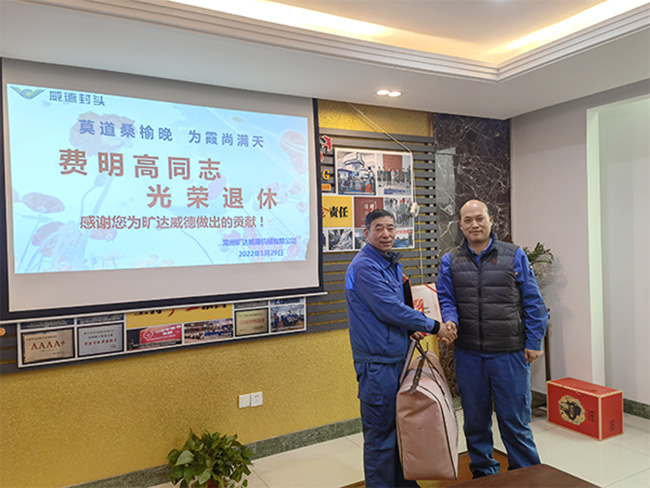随后,费明高同志也发表了临别感言,他回忆了在旷达威德的往昔岁月中的一点一滴,感慨着这些年与同事一起见证了旷达威德的成长和发展,感谢领导和同事们在生活和工作上给予的关怀和帮助。生活需要仪式感,紧接着,党支部宣传委员、副总经理常立寒为费明高同志佩戴了“光荣退休”的鲜花,工会主席、党支部副书记、行政副总龚文伟为其送上了退休慰问大红包,综合管理部部长陈亮为其颁发了“光荣退休”证书,生产管理部部长吴亦平为其送上了暖身暖心的“羊毛被”,副部长袁祖强为其送上了一份集满“人间烟火”的年货大礼包。大家在赠与的过程中和费明高同志互相握手,整个会场洋溢着温馨、快乐的氛围,在声声祝福中大家一起合影留念,美好的画面在这一刻定格。 此次欢送会对于费明高同志来说,也意味着他将开启人生新的篇章,祝愿他退休生活丰富多彩、幸福美满。