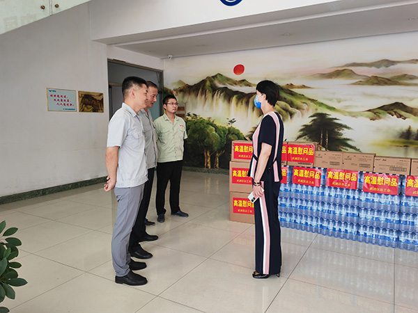 二、旷达集团总部的关爱让员工更舒心 7月14日上午,旷达控股集团董事长沈介良、财务总监吴志忠等总部领导冒着40度的高温天气带着一批防暑饮料来到我司,在旷达威德董事长曹立宏、总经理杨庆高、副总经理龚文伟、常立寒、综合管理部部长陈亮的陪同下,对员工进行了高温慰问。在行政楼二楼的党群服务工作室,曹总向集团总部的沈董事长和吴总简单汇报了旷达威德上半年来的生产经营情况,并就在建工程、万吨压机、十周年厂庆及下半年工作计划等情况一并作了汇报。公司的相关工作得到了沈董事长的充分肯定,并指出,在继续保持企业良好发展势头的情况下,积极关注上市的必要条件和准备工作。在进一步了解公司在防暑降温工作上的落实情况后,沈董事长要求企业在确保生产经营有序进行的同时,要时刻牢记安全生产,注意员工的劳逸结合。
