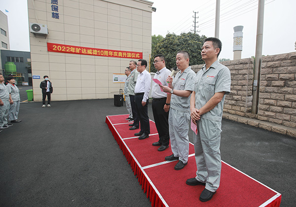 ——旷达威德10周年庆典升旗仪式圆满举行 2022年9月28日,旷达威德十周年厂庆时间如约而至,厂区里处处可见公司对此次庆典的重视。你看,厂区门外广场两边早早竖立着写满旷达人十年奋进、十年磨砺的感慨标语的红旗,正迎风招展着欢迎来访的客人。升旗仪仗队也早就来到了旗杆下进行模拟练习。质保楼旁边的升旗广场上,铺着红地毯的主席台引人注目,参加升旗仪式的员工也早已列队完毕,进行升旗仪式前的呼号热身。