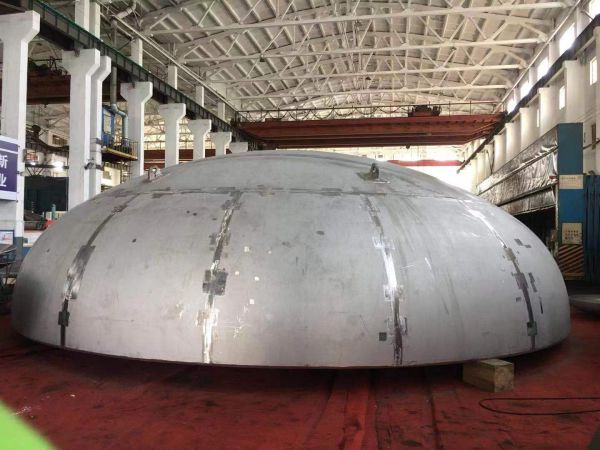 今年三月份,我公司接到国内某低温行业龙头企业1350立方米船用罐封头的订单,封头采用304类不锈钢制造,直径达8.5米。为了船上的装载量,船用罐本身的重量要尽量轻,也就是要控制船罐的壳体厚度,同时又要确保LNG的承压能力,保证最小厚度。经过我公司技术、生产、质保、销售等多部门与客户反复沟通,近半年紧锣密鼓的工作推进,客户代表、船东代表、挪威船级社(DNV)验船师等共同探讨,封头采用顶盖+瓜片组合成形工艺,而且顶盖球冠形投料与直边到小r部分的瓜片投料厚度不等。