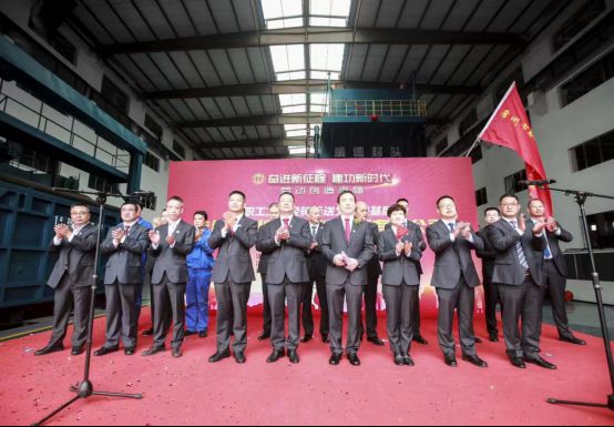 在公司宣传片和产改视频播放完后的8时58分,主持人杨庆高总经理宣布庆典仪式正式开始。随后9位代表登上舞台,他们分别是:旷达控股集团有限公司董事长沈介良、中国锻压协会理事长夏汉关、中国化工装备协会副理事长赵梦青、雪堰镇党委书记、武进太湖湾旅游度假区管理办公室主任武为锋、雪堰镇副镇长候选人徐卓、GB/T25198《压力容器封头》标准主编张义军、张家港中集圣达因低温装备有限公司总经理许志泉、江苏大明工业科技集团有限公司总经理汤高明、中国锻压协会副理事长、常州旷达威德机械有限公司董事长曹立宏。随着杨总一声“为万吨双动油压机正式投产剪彩”,一时乐声高亢、礼炮轰鸣、彩花纷飞,覆盖在10000吨双动油压机上的红布被瞬间揭开,亮出了她华丽的身影,为公司十周年庆典献上了特别“厚重”的贺礼,而全体员工起立自信满满的高呼“自主创新、振兴产业,贡献国家、回馈社会,做中国最大最强的封头专业制造商”,把庆典活动推向了最高潮。