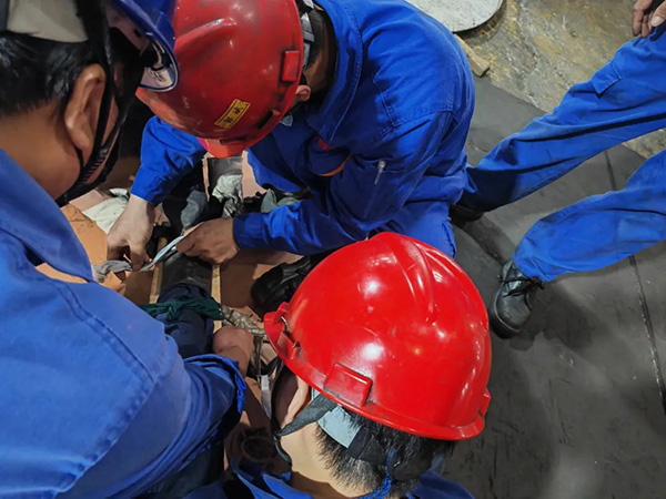 首先来到有限空间伤害事故演练地点,模拟有员工不小心掉入了FM10基坑,紧闭双眼呈现昏迷状态,现场警戒联络组立即拉起警戒线,工序负责人立即关掉运行机器,抢险抢修组立即运来照明器材、通风换气设备、气体检测仪、呼吸器等设备,在探知基坑内空气流动正常,无可疑气体泄漏后,救援人员把伤者扶持上来,尽快换上呼吸器,用上前段时间培训的心肺复苏,尽可能的争取救援时间。担架组可能初次上场,前后联络不够顺畅,迟了5分钟左右才登场把伤者搬运至模拟的救护车处。