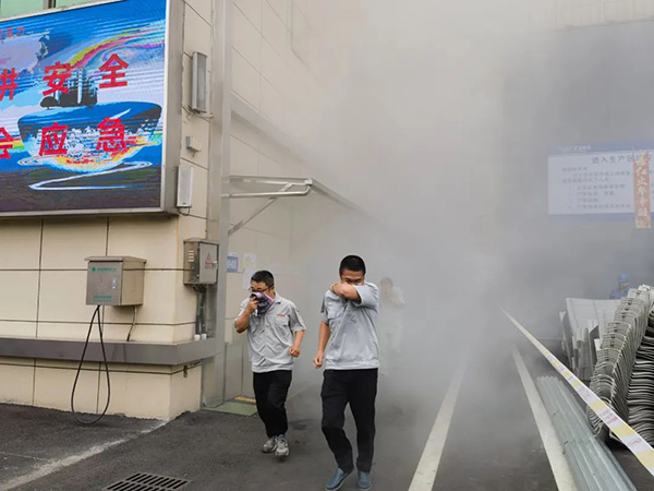 接下来又来到酸洗场地,模拟酸洗池里的部分酸液已外溅,发现的员工立即通知了工序负责人葛明峰,葛部长很快带着救援小组赶赴现场,各小组分工明确,配合默契,你看拉警戒线的多迅速,带着破布、黄沙和洗衣粉的员工穿戴好防护装备奔赴到事故现场,先把黄沙铺满铺平在外溅的地方,然后立即用破布把黄沙往中间推拢,紧跟着的员工把洗衣粉快速的撒在有酸液的地方,等待其中和反应后用清扫工具清理干净,反应迅速,应急到位,措施精准。 最后来到公司的行政楼,这里在开展火灾逃生演习,随着楼梯间的烟雾越来越浓,财务管理部周斌副部长一声喊:“火灾了,快跑!”行政楼的员工立即找到身边可以用来蘸水捂口鼻的毛巾,然后从楼梯上猫着腰往下有序逃生,跑至安全区域。看着大家被烟雾熏红的眼睛,还真有劫后余生的感觉。