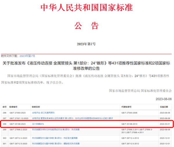 2023年8月6日,国家市场监督管理总局(国家标准化管理委员会)批准发布了中华人民共和国国家标准2023年第7号公告,其中公示了《压力容器封头》GB/T 25198-2023新版标准的发布,新版标准将于2024年3月1日起正式实施。 新版国家标准《压力容器封头》由TC262(全国锅炉压力容器标准化技术委员会)归口,TC262SC2(全国锅炉压力容器标准化技术委员会固定式压力容器分会)执行,主管部门为国家标准化管理委员会。主要起草单位包括合肥通用机械研究院有限公司、中国石化工程建设有限公司、常州旷达威德机械有限公司、宜兴北海封头有限公司、中国特种设备检测研究院、浙江大学等公司及机构。旷达威德总经理杨庆高作为主要起草人之一,带领公司部分技术人员参与了此次标准的修订工作。 国家标准《压力容器封头》作为我国压力容器行业完整和统一的封头标准,是封头制造厂家生产、制造和检验的主要依据。旷达威德作为此次新标准的主要起草单位,同时也是其中位列第一的封头制造厂家,印证了公司在封头行业中的龙头地位,也说明近些年来公司在品质追求、工艺革新和技术研发等方面的成就,得到了同行及专家的高度认可。