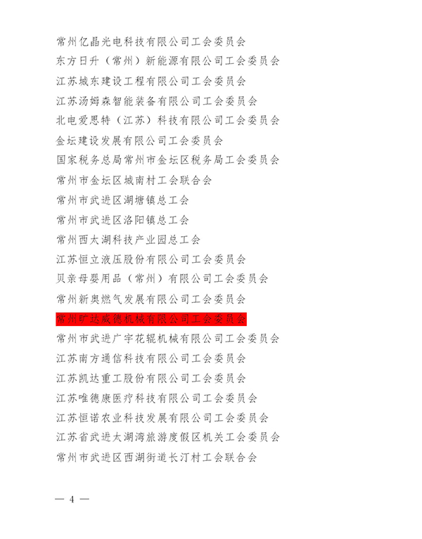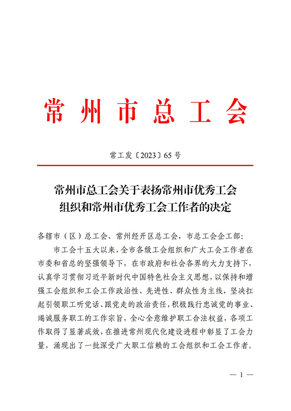 近日,常工发【2023】65号文件《常州市总工会关于表扬常州市优秀工会组织和常州市优秀工会工作者的决定》附件常州市100家优秀工会组织名单上,常州旷达威德机械有限公司工会委员会赫然在列。