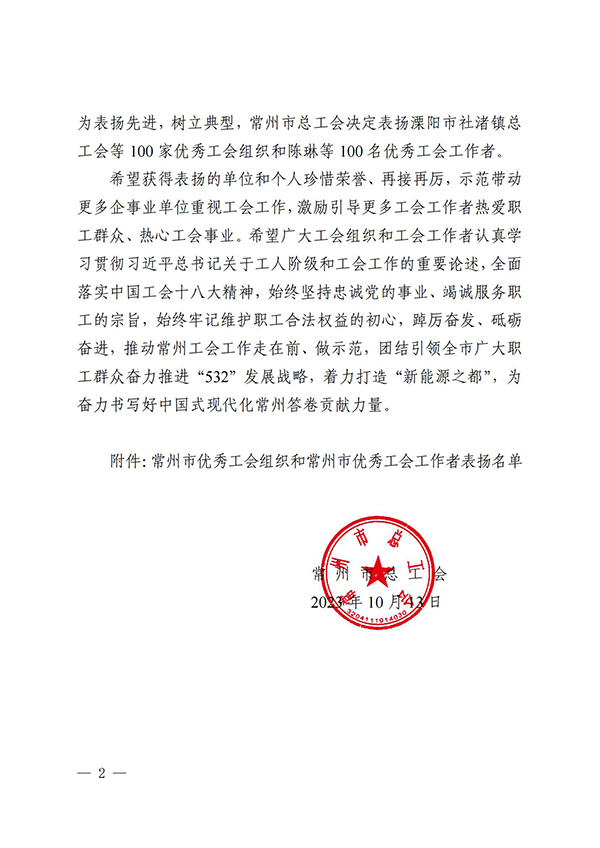 此次公司工会获评“常州市优秀工会组织”,是上级工会对我们工作的高度认可,也是对我们今后工作的勉励。我们将继续围绕公司全年生产经营目标展开工作,把服务意识纵向深入,让员工参与感、满意度、归属感大大提升;努力提升工会服务水平,维护职工合法权益,提高职工职业素养,助推公司高质量发展。