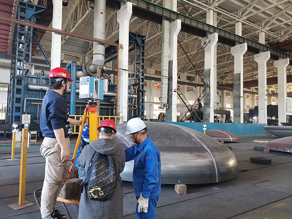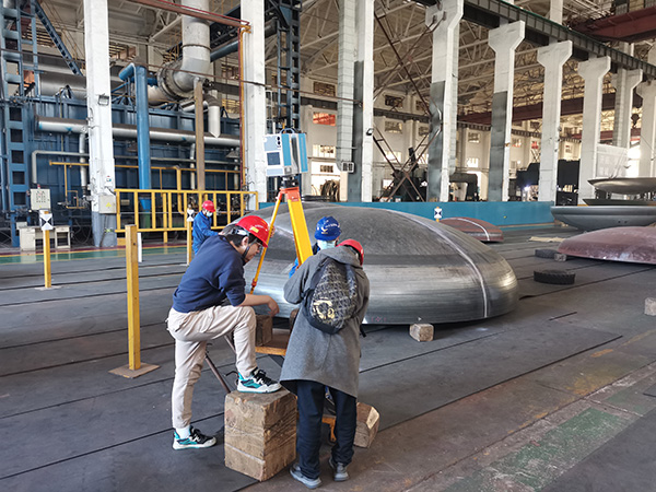 此次旷达威德诚意邀约公司技术领域的专家李教授来司调研,主要是通过引进人才,让其结合自己的专业方向,针对企业的实际生产需要,攻坚克难,帮助壮大公司的研发团队,并在公司的研发方向、新产品开发、专利申报等方面出谋划策。为此总经理杨庆高与李教授就公司产品情况,目前存在的难点,需要解决的问题等等进行了讨论。李教授说目前要先了解产品的参数,才可以对后续的研发做到心里有数。在总经理助理兼生产管理部部长吴亦平的陪同下,他们来到车间对封头进行测量和数据收集。测量封头,用三维激光扫描仪测量封头的轮廓,对比标准图样,检查实际制造的产品和设计的误差,再计算分析封头的受力数据,判断封头的制造断面公差合理程度,公差是否可以调整。