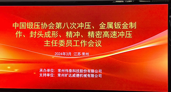 2024年3月20日中国锻压协会第八次冲压、金属钣金制作、封头成形、精冲、精密高速冲压主任委员工作会议在江苏常州顺利召开。会后,协会执行副理事长张金、副理事长齐俊河及各分会主任委员一行来到常州旷达威德机械有限公司交流指导。