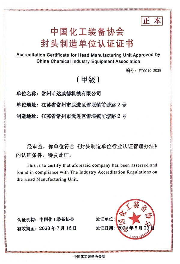 2024年4月27日,中国化工装备协会三位专家组成的评审组,对常州旷达威德机械有限公司封头制造单位认证证书(甲级)换证进行了现场审查。
