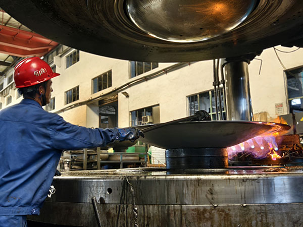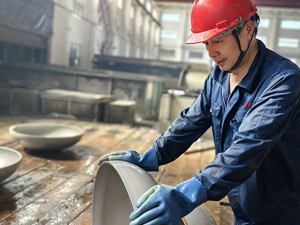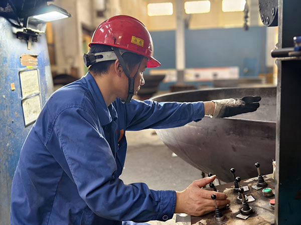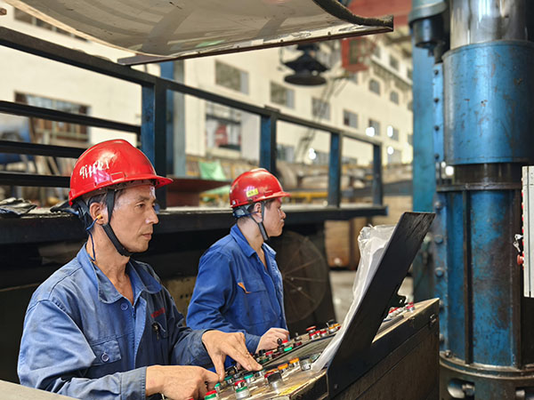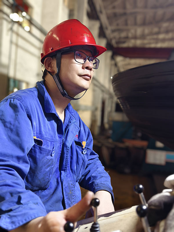 均衡施压 精准成形 他们找对模具,把钢板放置在相应的位置,紧盯操作台,按下一个个像“音符”一样的操作键,犹如技艺高超的“演奏师”,他们就是成形工序的冲压师傅们。看他们汗湿衣衫,分工明确,不一会儿,一个产品就成形了。他们自检内在质量和外表面的质量,测量板厚的减薄情况、周长或直径的数据,外表面有无鼓包、皱折、凹坑等。他们的精准制作,对后续的交期提供了有力保障。再来看看我们的旋压工序,省劳模梁泽锋正在旋压操作,他时而盯着“音符”,时而看着随机旋转的产品,双手不停的转换,真的就像在弹奏着一手优美的曲子。他在旋压操作的时候,是如此的轻松和惬意,没有一丝的慌乱,真正做到了专心、专业、专注。他旋出来的产品基本是免检的,内在质量和外在质量堪称“完美”,将“匠心所指 精益求精”发挥到极致。另一台旋压机上正在操作的是张彪,他主攻热旋压,是个“多面手”,热旋压不忙时,就在冷旋压等工序帮忙。他也娴熟的弹奏着“音符”,对于内在或外在质量也都做到了心中有数。要想成为“演奏师”,得经过多年的打磨,做到勤勤恳恳为工,兢兢业业为匠。