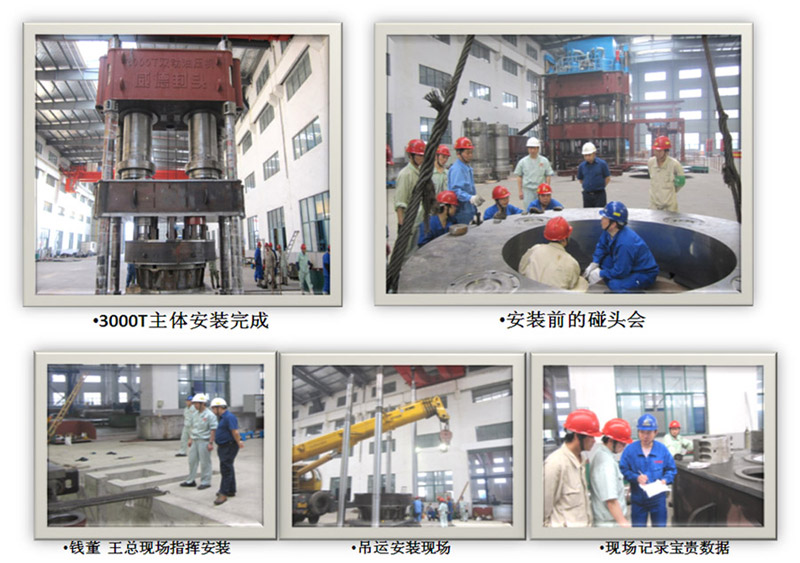 清晨,以钱凤明董事长、王健总经理、杨庆高部长等为首的公司领导早早的到达了安装现场,全体技术工程人员也准时到达了施工现场。6:30分,3000吨双动油压机正式开始吊装,在安装过程中,全体人员、各就各位、按部就班、协调一致、通力合作。一块块巨大的基座被平稳的放在定位线上,一根根参天的立柱笔直的耸立在厂房的中央。安装采用高精度的“自动安平水准仪”,经过准确的测量、实行了精确的定位,确保不出现丝毫的偏移。要做到这点,各个部件在安装时需要绝对保持清洁和光滑,如若否之,会导致安装时尺寸偏移,影响后续机器设备的高效使用,更甚之,出现安全的隐患,所以,为了保证万无一失,工程技术人员们对一个个零部件进行了精细的打磨、擦拭,以确保制造出一台高精度高品质的压制封头的机器来。这应验了公司的质量方针:“遵规守法,精细制造,以一流的产品开拓市场;自强不息,科学管理,以一流的服务赢得客户”。