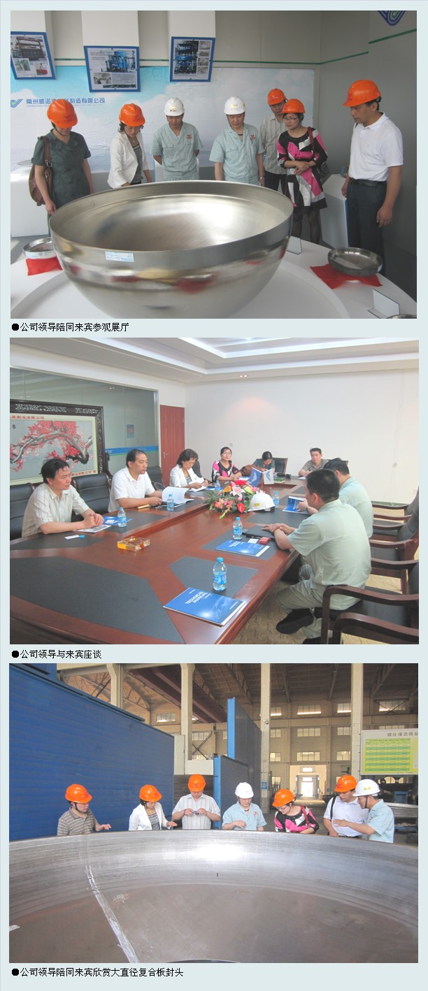 代表团首先兴致勃勃地参观了威诺德生产车间及产品展览室,然后,在公司贵宾会议室,宾主双方进行了坦诚友好的座谈交流。座谈时,龚文伟副总经理首先向客人介绍了我公司的基本情况及发展态势,随后,三明天尊不锈钢复合科技有限公司副总经理蔡春秀介绍了该公司近年来在不锈钢复合技术的研发、应用与推广方面的主要工作,并表达了与威诺德的合作意向。紧接着,张丽娟区长介绍了梅列经济开发区想借助福建省三钢(集团)有限责任公司的优势,做强新材料产业园的情况,并介绍说,三明天尊不锈钢复合科技有限公司是梅列区利税大户福建三钢小蕉实业发展有限公司下属的子公司,也是福建省唯一的不锈钢复合板生产企业,希望威诺德在不锈钢复合板的用材上能给予三明天尊更多的机会。威诺德王健总经理表示,不锈钢复合材料的应用对减轻压力容器成本,优化压力容器性能有着重要作用,钎焊复合板相对于爆炸复合板更适宜封头的成形,公司愿意与三明天尊在这一领域携手合作。王总还为三明天尊的不锈钢复合板应用和推广提出了许多建议。