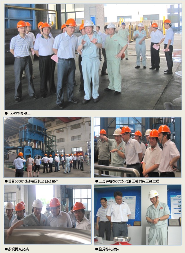 在参观工厂其间,王总按照封头加工的工序向领导们逐一进行了详细介绍,同时,领导们还饶有兴致的观看了全自动6600T双动油压机压制封头的全过程。当区委领导得知公司去年刚投产当年就完成2.5亿元销售,今年目标锁定5亿时,领导们对公司在企业转型升级中取的骄人业绩给予了高度的肯定和赞叹。