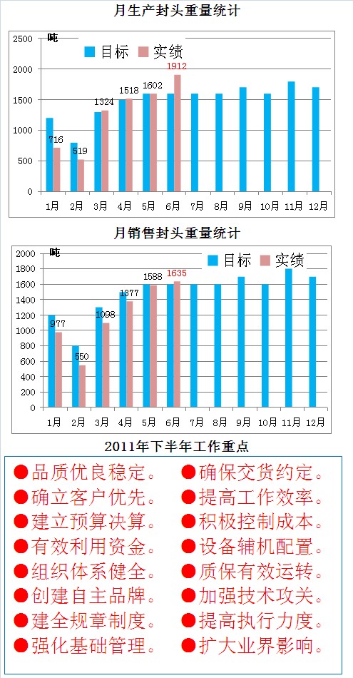 7月6日,王健总经理如期向公司全体员工作WD·2011年中期报告。 王总跟往常一样,首先带领大家重温了公司纲领:自主创新、振兴产业,贡献国家、回馈社会。他总是想让每一位威诺德人牢记公司崇高的使命,恪守既定的价值观。紧接着,他又反复强调了公司的经营方针:价格合理、品质优异,交货及时、客户满意。他力图让每一位威诺德人明白,这四点经营方针,任何一点都必须坚守,这是市场竞争的四大制胜法宝。 其次,王总通报了半年度经营业绩:生产封头7600吨,完成销售2.4亿元,其中不锈钢封头比例为69.23%,生产封头个数34975个,半年度计划总达成率为101.85%。他对2011年上半年公司的经营情况作了中期汇总,并归结为:隆重举行开业庆典,行业地位明显提升,品牌效益日益突显,设备辅机不断配置(2200吨压鼓整机、3000吨压机辅机、FM4冷旋压机先后投入使用,冲压、旋压模具基本完成,打磨机、手动抛光机按计划增加,FM4.5热旋压机在制),生产经营初具规模,组织体系得以建立,规章制度不断完善,质保体系运转良好,行业用户普遍认可,远期发展正在筹备。 接下来,王总要求全体员工明确2011年下半年工作重点,并将其归纳为:确保品质优良稳定,确保交货约定,确立客户优先,提高工作效率,建立预算决算,积极控制成本,有效利用资金,继续配置设备辅机,不断健全组织体系,确保质保有效运转,加快创建自主品牌,大力加强技术攻关,加快建全规章制度,大力提高执行力度,日益强化基础管理,不断扩大业界影响。 公司下半年的主要计划指标是:每月生产封头平均1500吨,到年底完成总销售金额4.5亿元。 其它分列计划指标是:交货合格率≥99.985%,不锈钢比例≥50 %,焊接一次合格率≥98%,生产天数≤5天,生产延期率≤3%。 王总在大会上还概括了公司的优势:设备品种齐全、优势明显,员工战斗力强、团队协作好、技术能力强、生产效率高、销售能力强、企业口碑好。同时,王总语重心长地说,在大力发扬现有优势的同时,还要清醒地认识到在激烈的市场竞争下,公司必须在稳定产品质量、确保按时交货方面进一步努力,在加强部门沟通、保证人员稳定和打造企业文化方面进一步作为。 最后,王总组织全体员工再次学习了公司的质量方针、品质目标、员工精神、企业愿景、销售方针、安全方针和生产方针。