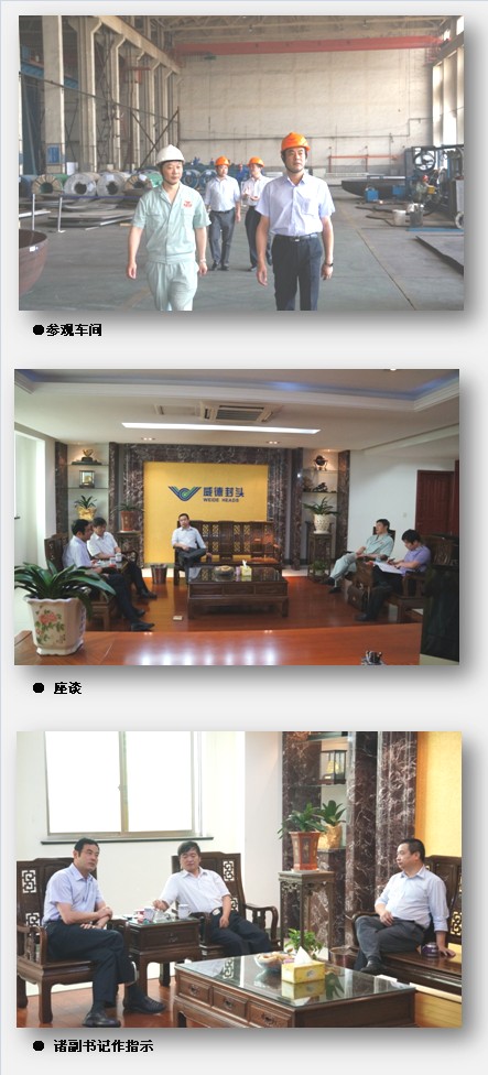 诸副书记一行下车后就直接参观了公司的展品陈列室和生产车间。在参观车间期间,王总为各位领导详细介绍了封头制作的全过程,以及公司目前生产设备的加工能力和特点。座谈中,王总还详细介绍了公司目前的经营状况以及公司在行业中的地位。当听到公司在短短两年内就取得行业中规模最大、产能最高的成绩时,领导们不由得发出声声赞叹。诸副书记表示,公司能在市场持续低迷的情况下仍然保持稳定增长的发展态势,实属不易,希望威德封头不断做大、做强,为推动地方经济发展做出更大的贡献,与此同时,对于威诺德这样的成长型优秀企业,区委、区政府也将不断加大扶持力度。