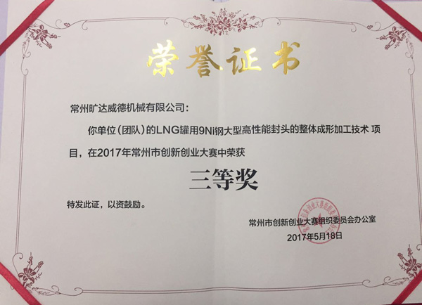 近日,常州旷达威德机械有限公司“LNG罐用9Ni钢大型高性能封头的整体成形加工技术” 项目经过初赛和决赛(路演与答辩),最终荣获2017年常州市创新创业大赛三等奖。