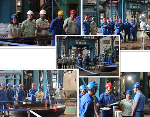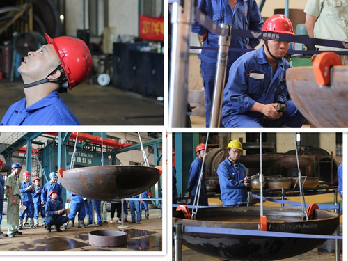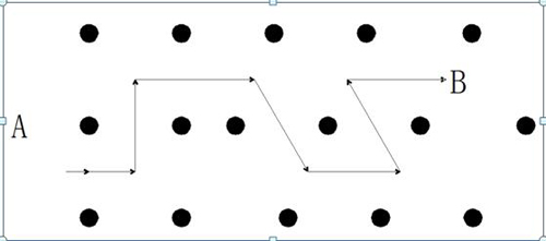 生产管理部袁祖强副部长宣布参赛要求(如图2所示)。本次比赛使用计时方式从A点起吊,按照既定路线实现“游龙式行走”经过如下“梅花桩”障碍区,“梅花桩”的桩间距离为2200mm。比赛吊运物品选用我公司生产THA2000*12的封头一枚,在内表面直边处沿坡口面向下20mm、30mm处分别做好标记,将封头放置于A点托盘内,注入水到刻度20mm标记处。参赛选手将封头从A点搬运至B点后,放置于B点的托盘内,再从B点搬运至A点,吊具放好比赛结束,比赛用时最少者获胜。 图2:比赛行走线路图。