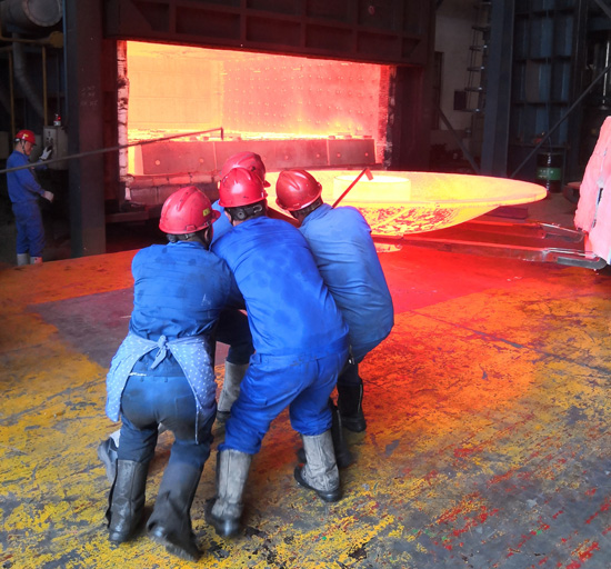 保温时间到了,热处理炉炉门开启,两个热气逼人、通体发红的封头立即闪现在眼前,虽然叉车车身前部被隔热棉遮住了大部分,影响到了视野,但是叉车工还是很娴熟地将封头铲出,当封头稳稳的落在铲齿的那一刻,潘志国加大油门,争分夺秒快速掉转车头,火速前进将炙热如火的封头放入6600T的移动工作台上。生产部副部长袁祖强手持高温远红外测温仪一路奔跑记录热冲封头的温度。而6600T所有接应人员也屏住呼吸,主操作工一气呵成将工作台送入模具正下方,快速调整好模具中心,在模具重重的压力下,一次热冲压封头就这样诞生了,当模具抬起,封头工作台升起,被压成型的封头像身穿暗红色礼服的主角一样展示在大家眼前,所有在场人员都相视而笑,发出阵阵掌声,有的竖起了大拇指。第一个热冲封头完成得很顺利,也给了大家一个坚定的信心,大家在热冲封头旁脸上都挂满了汗水,但心情却是无比的激动。