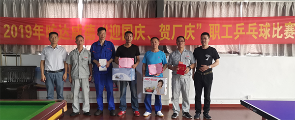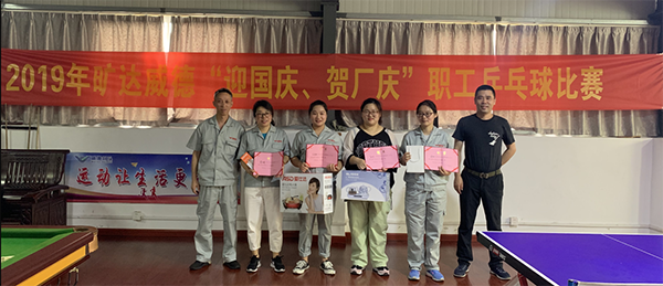 2019年9月15号,公司为了庆国庆,贺厂庆,再次开展了乒乓球,象棋,台球,唱歌比赛。上午8点我作为旷达威德公司一名资深老员工有幸参加了乒乓球比赛。本次比赛由公司工会主办,由行政副总龚文伟担任现场总指挥,生产部副部长吕向阳担任裁判,财务部长金勇担任记分员。比赛采取11分制和三局两胜制。期间,选手们本着“友谊第一,比赛第二”的原则,你来我往,各展所长。赛场上各位选手直拍与横拍,进攻与防守,推挡与提拉,比赛现场气氛热烈而和谐,欢声笑语不断。大家在比赛中你争我夺,不放过任何一个机会,充分展现了集体凝聚力和荣誉感,不服输的劲头展现得淋漓尽致。本次比赛每名参赛选手都赛出了风格,赛出了水平,同时也交流了感情,切磋了球技,增加了友谊。半天的比赛精彩纷呈,高潮迭起。出色的球技、矫健的身姿不时赢得阵阵掌声与满堂喝彩。 经过激烈比拼,最后女子组比赛由采购供应部孙欢再次拔得头筹,这个姑娘不简单,别看她平时大大咧咧,所有比赛都能看到她的身影,借用汤姆贾诺维奇的一句话:你永远别低估一个冠军的心!第二名由后起之秀综合部的吉维维夺得,这恰恰应了一句:明明可以拼青春,而这小姑娘且用了实力!第三名由工务科永远只知道卷起袖子默默干的周丽云夺得。男子组第一名是焊接班张正涛,他常挂嘴上的一句话:不努力,永远没机会!第二名是设备班的干将陆益文,第三名是旋压能手张彪。他们几个都表现出色,黑马涌出,平时大都深藏不漏,现场发挥淋漓尽致,我们由衷感叹:真是高手在车间啊。最后是工会主席龚副总为获奖选手颁奖并合影留念。 生命在于运动,运动在于锻炼,锻炼在于坚持,坚持就能胜利。通过本次比赛,活跃了干部员工的业余文化生活,为员工提供了展示自我、相互交流的平台,同时也提高了彼此间团结协作与交流沟通的能力,营造了团结奋进、乐观向上的良好氛围,也展示了我运动、我健康、我快乐的运动精神!让我们一起为国庆、厂庆欢呼吧! 为喜迎祖国成立70周年,庆贺厂庆7周年纪念日,同时为丰富员工文体活动,加强公司各部门之间的沟通交流,增进员工间的友谊,营造和谐的公司文化氛围,公司于9月15日起举行了一系列国庆&厂庆纪念系列活动。